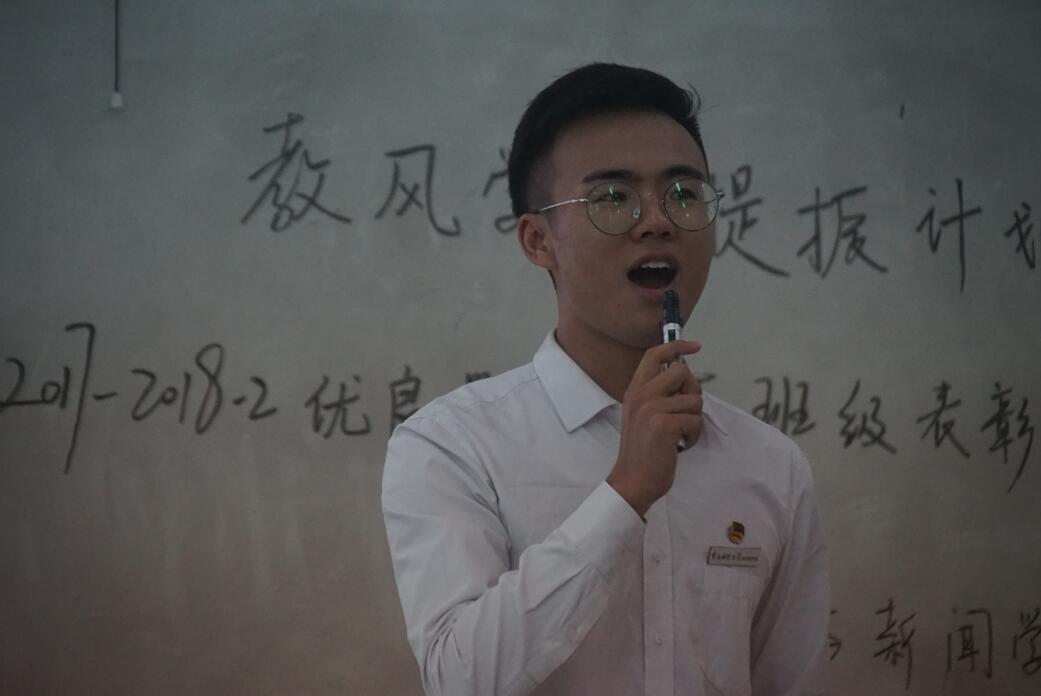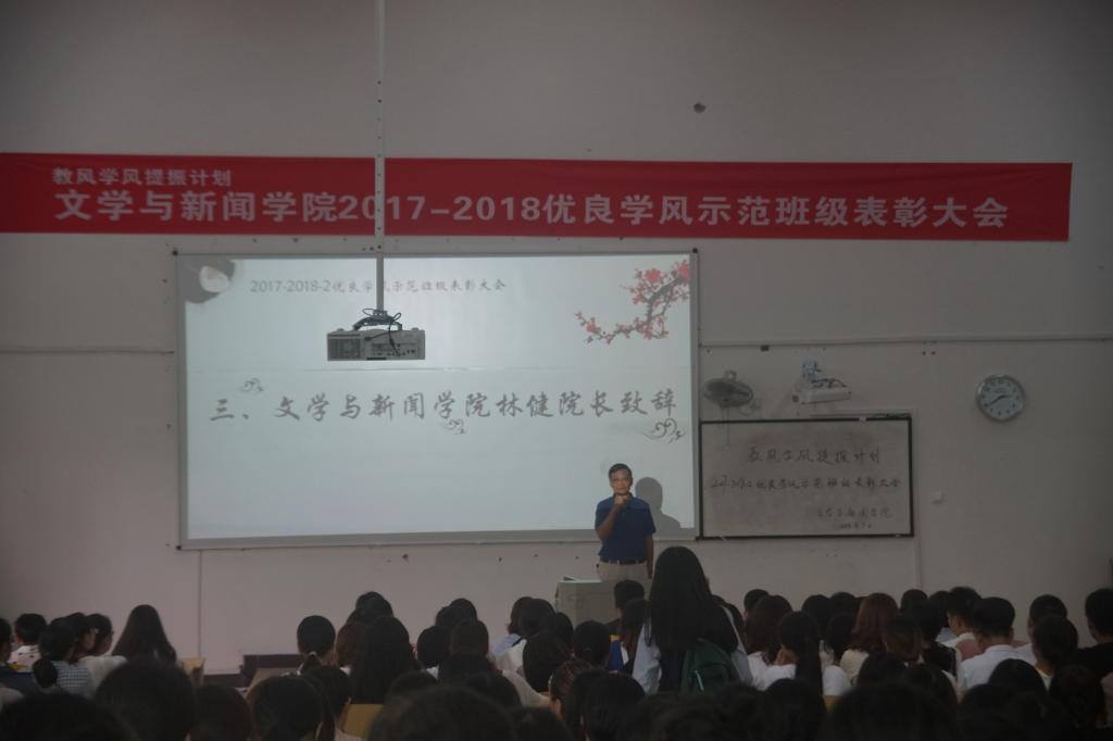 大会开始,员工会主席廖中婷致开场词并宣布到场领导。接着林健经理发表讲话,林经理指出,文学与新闻学院各班级应弘扬班级正气,传播正能量,宣扬不耻下问的精神,建立和谐的学习氛围。林经理的讲话表达了对文新学子的殷切希望,同学们也报之以热烈的掌声。随后由团总支书记兼员工工作办公室主任曾贵老师宣读此次优良学风示范班级评选规则并宣布了获奖班级,分别是2016级汉语国际教育3班和2017级汉语言文学(师范)14班。林健经理为获奖班级颁奖。接着2016级汉语国际教育3班团支书艾长川作为班级代表发表讲话,阐述了优良学风的班级是怎样形成的。最后员工会主席廖中婷致结束词,宣布此次表彰大会圆满结束!