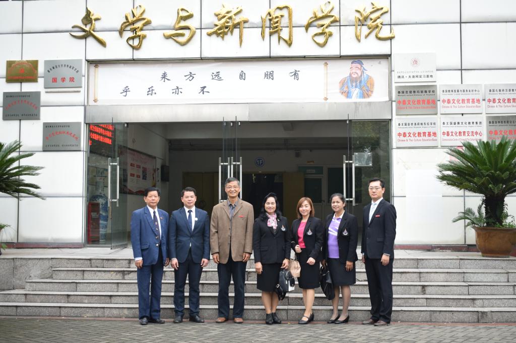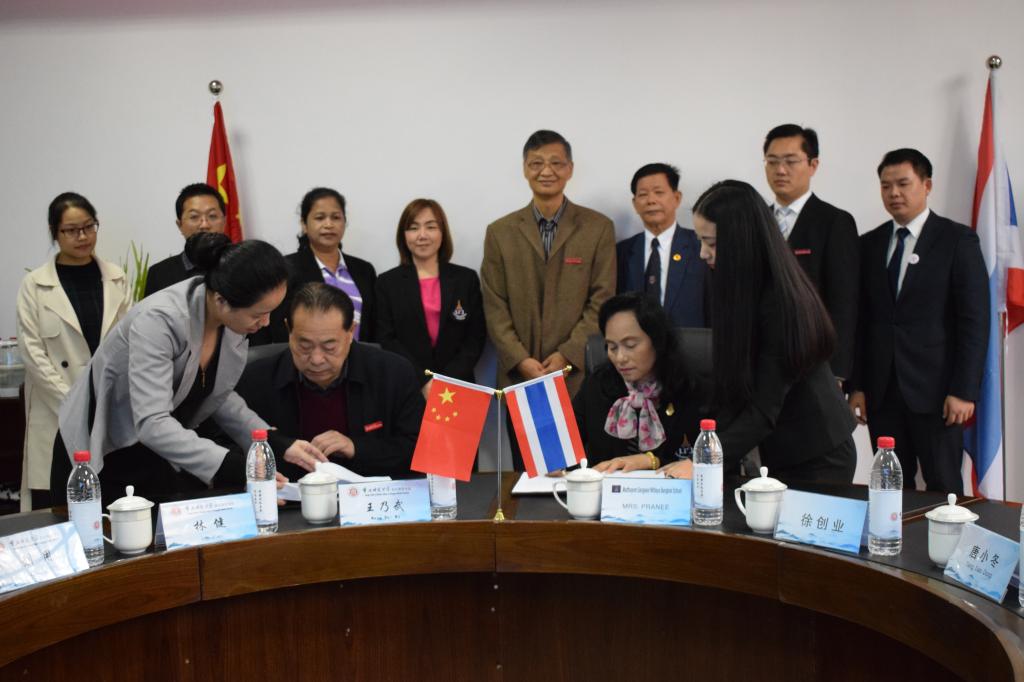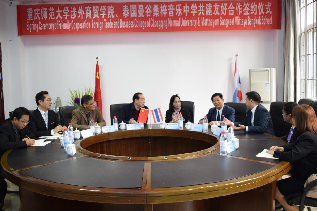 2018 年10月24日10:00,重庆师范大学涉外商贸学院与泰国桑梓音乐中学在国际学院G105举行签约仪式。出席本次会议的有:重庆师范大学涉外商贸学院常务副董事长王乃武,泰国桑梓音乐中学董事长Mrs.PRANEE、教务长Mrs.CHOLTICHA、老师Ms.MASSARIN,盛唐文化教育集团董事长唐小冬、泰语顾问徐创业,国际交流处处长刘用,文学与新闻学院经理林健、副经理王杨丽、党总支书记何杨波、辅导员林燕。