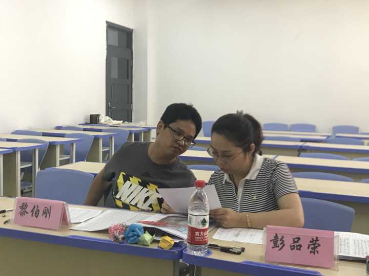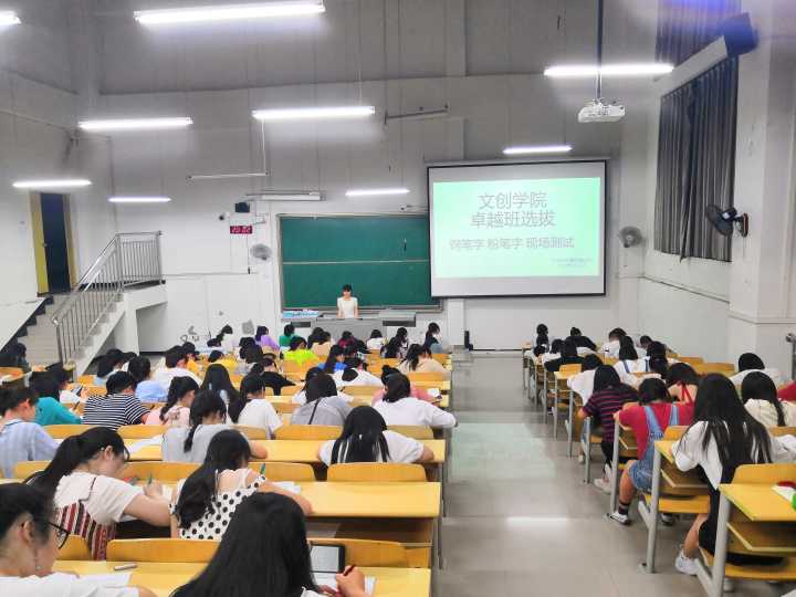 26日上午在C栋教学楼进行了初试,163名同学被分为三个小组。第一组由冯少明和李玲老师担任评委,第二组由彭品荣和黎伯刚老师担任评委,第三组评委则由吴静和江霞两位老师担任。初试考查内容主要包括钢笔字、粉笔字、自我介绍、演讲、特长展示等。参加选拔的同学向评委进行自我介绍,在回答完评委的提问后进行才艺展示。这一环节中,同学们各显神通,有钢琴过六级的,有擅长书法和国画的,还有会吹笛、唱歌和剪纸等其他特长。经过筛选,最后参加初试的163名同学中有60人进入复试环节。