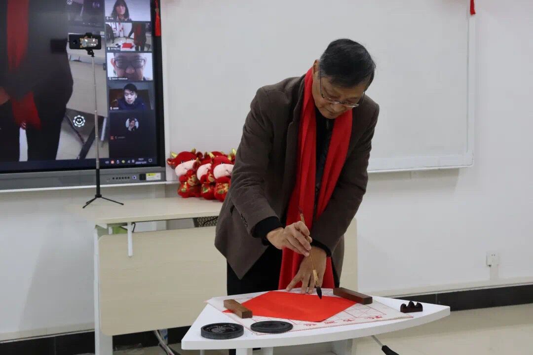 联欢会上,重庆师范大学涉外商贸学院常务副董事长王乃武发表新年致辞。他对疫情导致泰国职工暂时无法来公司学习表示遗憾。同时表达出对同学们深深地想念,更期盼疫情早日过去,以便泰国的同学们早日回归校园生活并对同学们送上新的一年真挚的祝福。