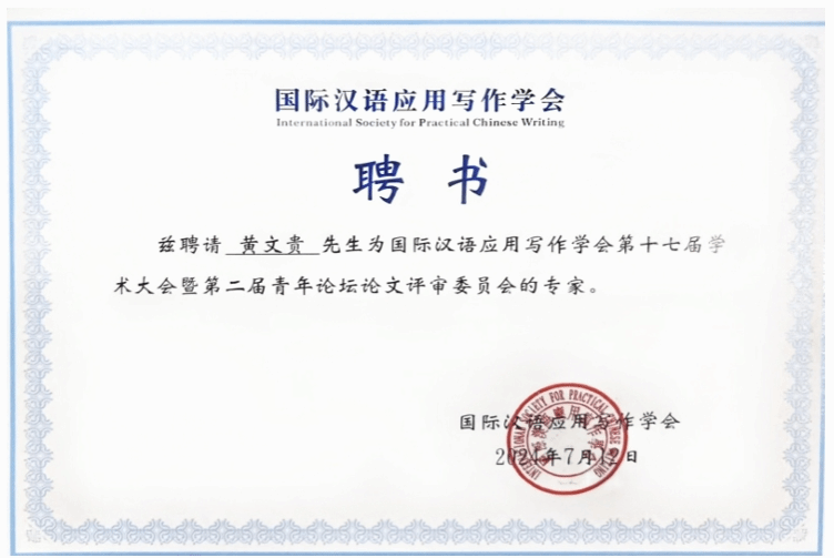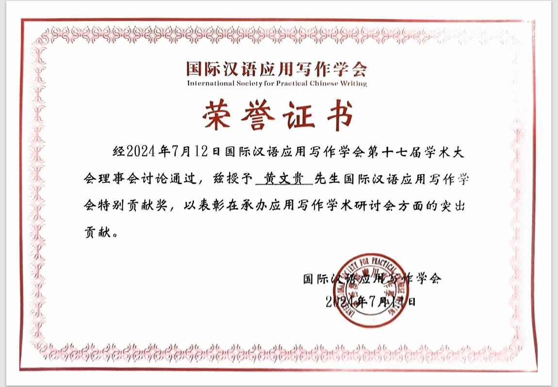 会议的学术研讨包括专题学术报告、大会主题发言、分会场研讨,以及青年论坛专题讲座和分组研讨、自由发言等多个学术交流环节。黄文贵副教授担任了本次会议分会场代表发言的学术评议人以及青年论坛的学术观察员,并受聘为大会论文评审委员会专家。因在承办应用写作学术研讨会方面的突出贡献,在学会发起成立30周年之际,黄文贵副教授还被国际汉语应用写作学会授予特别贡献奖。