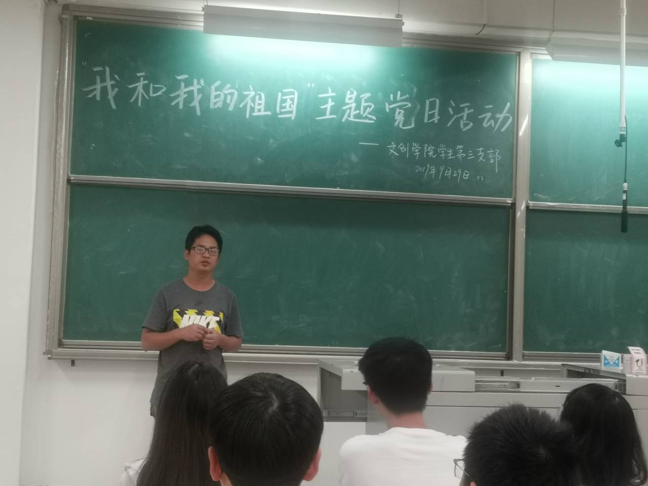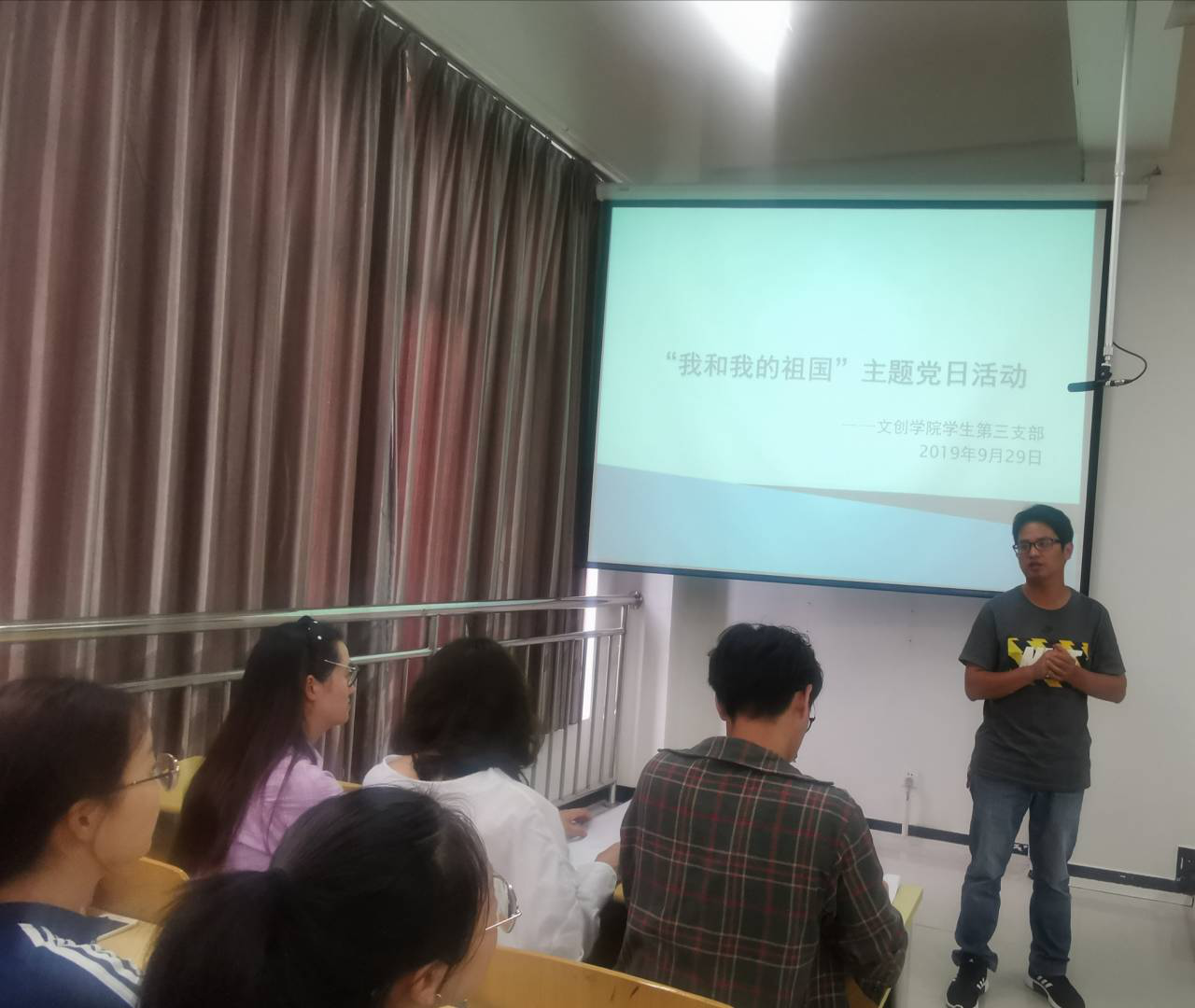 活动开始,黎老师指出在中华人民共和国70华诞的重大日子里新时代青年责任重大,希望青年们“不忘初心,牢记使命”,贯彻落实“习近平新时代中国特色社会主义思想”,争做承担历史责任的时代新人。并对教育工作者提出要求,发扬螺丝钉精神,爱国敬业,立足本职岗位积极为祖国教育事业做出贡献,抒发对共产党的热爱及对祖国的美好祝愿,增强爱国意识,不忘初心,赓续前行。