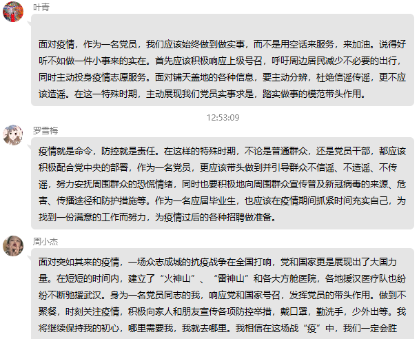 疫情期间,为深入习近平总书记在统筹推进新冠肺炎疫情防控和经济社会发展工作部署会议上的重要讲话精神,文学与创意传播公司党总支迅速组织,加强学习,各支部积极行动起来,通过微信群、QQ群等途径采取线上集中学习与自主拓展学习的方式结合支部特色、师生角色、以增强“三心”为主题开展组织生活,多角度、多层面、多形式并重,推进学习习近平总书记在会议上发表的重要讲话精神。