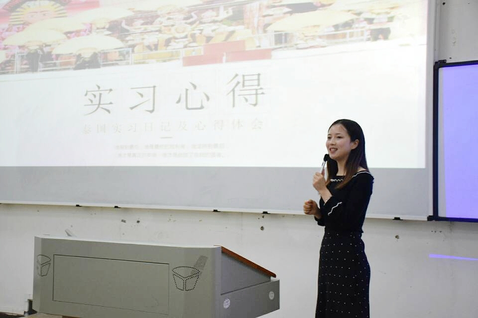2015级汉师6班范燃新同学对泰国师生礼仪风土人情和日常工作的趣事进行了简要介绍,并以亲身经历向大家说明了人格魅力的重要性;2015级汉师7班陈丫同学以一段赴泰期间录制的温馨视频来向大家介绍“礼尚往来”不仅是中国的传统美德,也是泰国友人们的待人方式,告诉大家要勇敢面对生活中的酸甜苦辣;16级汉师4班何雯同学以幽默风趣的语言介绍了在泰国学校的所见所闻,向大家展现了泰国人民积极、纯朴、可爱的一面;2016级汉师5班吴慧会同学讲述了赴泰实习给自己带来的改变和进步,并将中泰文化进行对比介绍,呼吁大家重视对优秀传统文化的学习和继承。最后曾贵老师对此次交流会进行总结性发言,提炼了三点关键内容:视野和格局、学习和反思、爱和行动。
