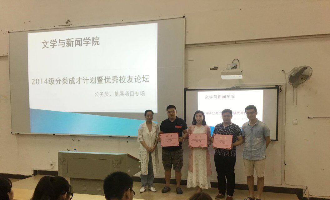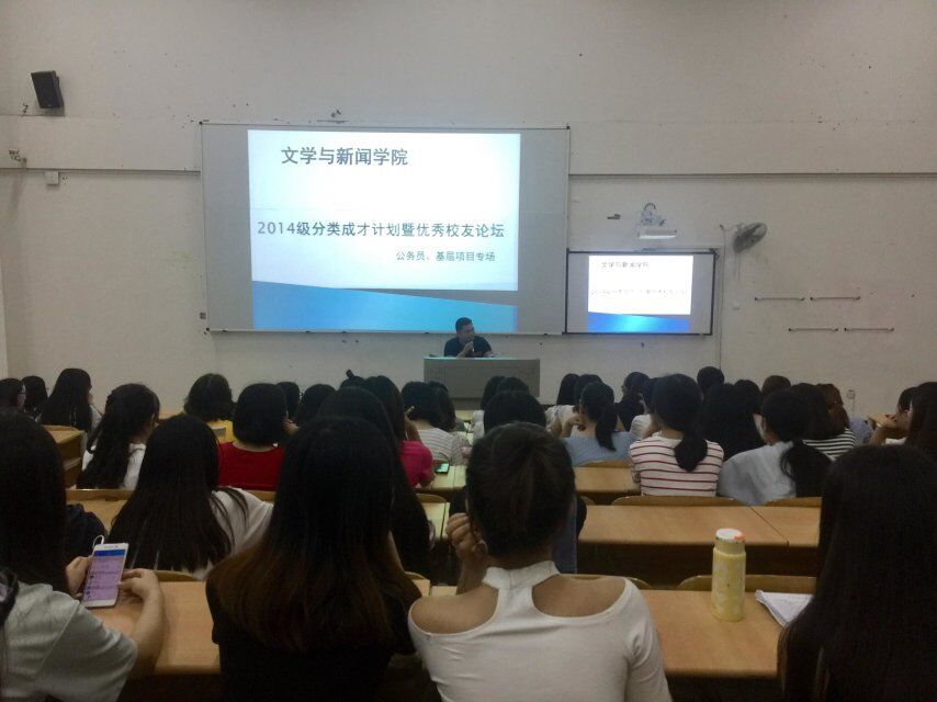 本周日19:00公司在6116召开了2014级本科员工职业规划与就业指导暨优秀员工论坛。参加本次论坛的有团总支书记曾贵老师,辅导员林燕老师、李玲老师以及朋辈导师罗尚维、王晋毓、罗嘉鑫等三位优秀的文新学子。2014、2015级选择了公务员和基层项目就业意向的200多名同学参加了讲坛。
