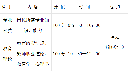 面试项目为专业技能测试和综合面试,各项目分别占50分,专业技能测试的方式有说课、实作考核,音体美、信息技术教师岗位设置实作考核;综合面试的方式为结构化面试。