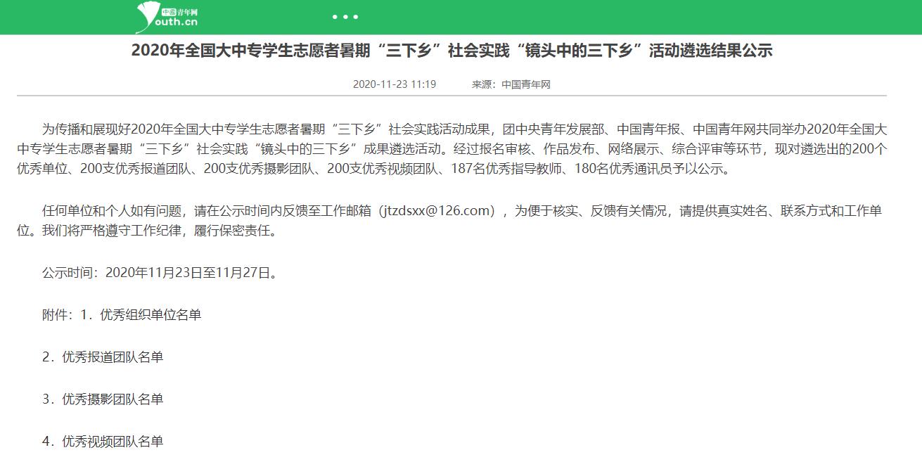 “千校千项”评选活动由共青团中央宣传部指导,中国青少年新媒体协会、中青在线共同主办,经过作品申报、资格筛查、网络点赞、专家评审四个环节综合评选得出。2020年全国大中专员工志愿者暑期“三下乡”社会实践“镜头中的三下乡”成果遴选活动,由团中央青年发展部、中国青年报、中国青年网共同举办。经过报名审核、作品发布、网络展示、综合评审等环节进行评选,活动旨在发挥典型的示范作用,引领广大青年员工在社会实践中受教育、长才干、做贡献。