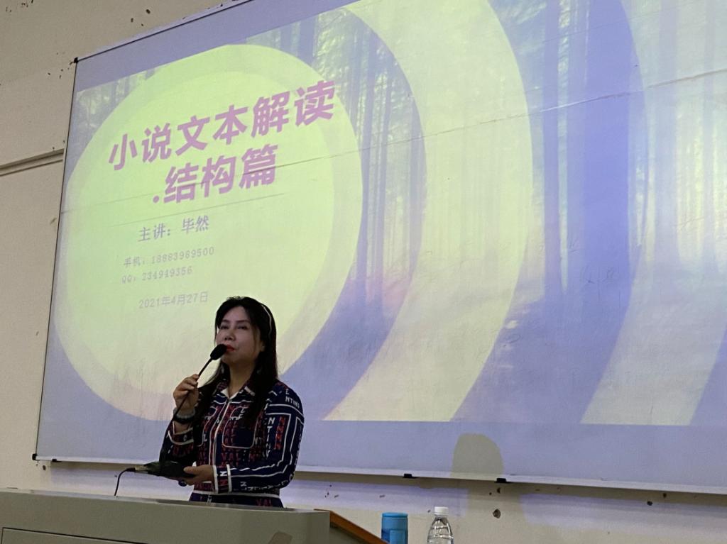 公司特邀了国家二级作家、中国作协会员、插画家、现任重庆移通学院创意传播学院驻校作家的毕然副教授作主题讲座。2019级汉语言文学(师范)、汉语国际教育、新闻专业近200名员工积极报名参加此次讲座,此次活动由吴鹏老师主持。