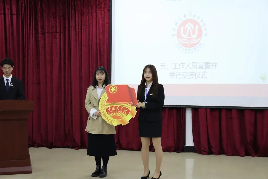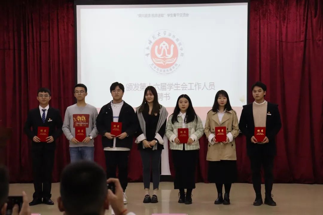 随后,由赖芸屹老师和李香贞老师为第十六届员工组织工作人员颁发聘书,并与工作人员们合影留念;聘书发放完成后,赖芸屹老师上台宣读批复及聘用名单,十七届员工组织成员们端正坐姿,听到自己的名字,骄傲而又自豪。