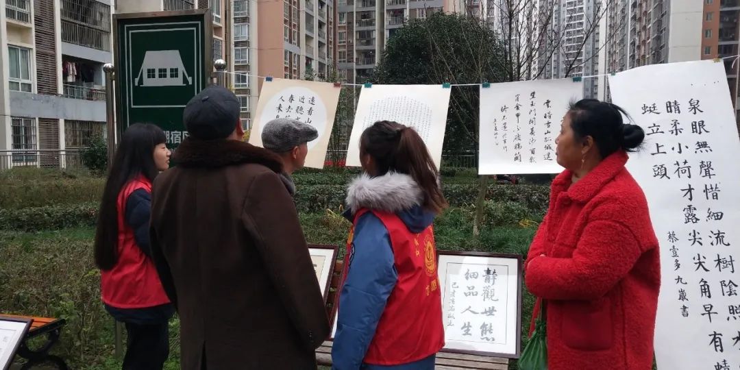 活动开始之前,志愿者首先协助社区工作人员们整理活动场地,拉好横幅,将书法作品悬挂在社区道路两侧,以便居民观看欣赏。