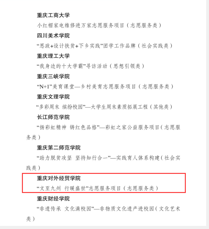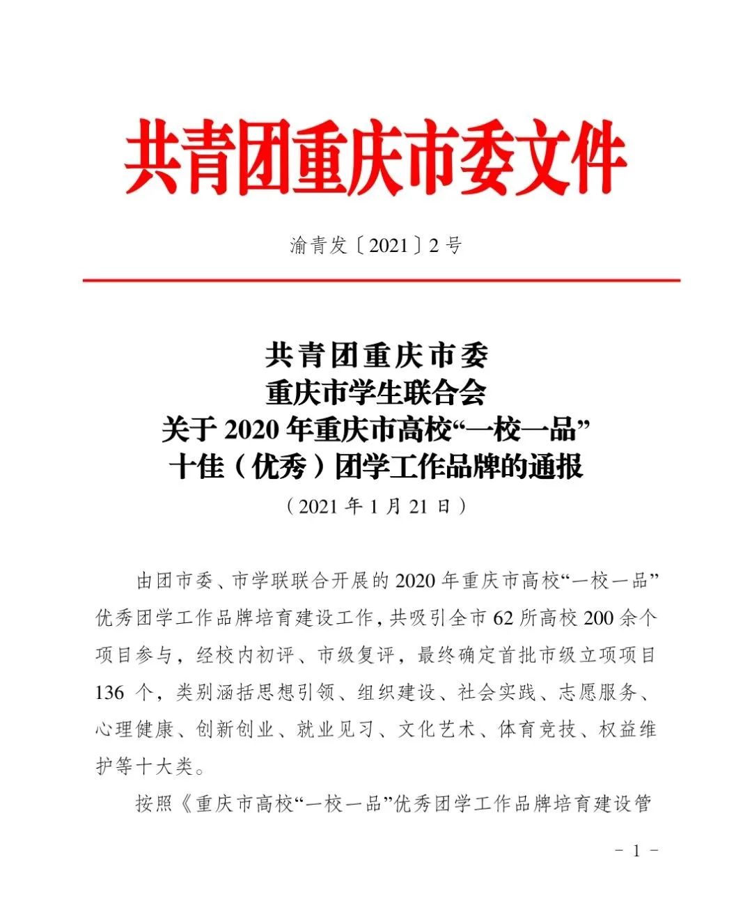 公司“文至九州 行暖盛世”志愿服务项目经申报于2020年9月成功立项,2021年1月10日在线上参与2020年重庆市高校“一校一品”团学品牌汇报工作与答辩。最终从全市62所高校200余个项目中脱颖而出,荣获2020年重庆市高校“一校一品”优秀团学工作品牌。