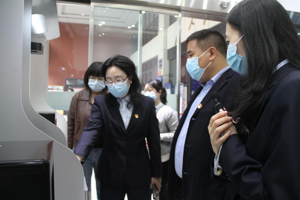 吴志琼书记展示功能一体机的操作情况 秦远扬副主任介绍服务大厅窗口设置情况