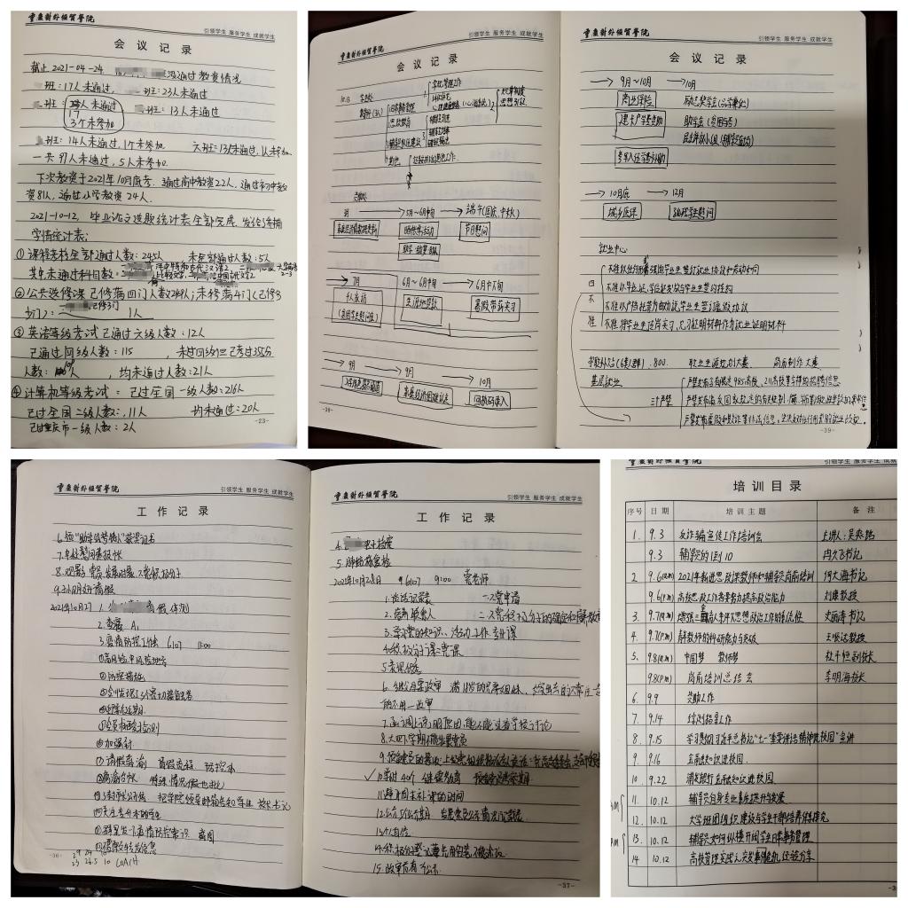 目前,每位辅导员人手三本统一印制的《辅导员工作记录》、《辅导员思政主题教育记录》、《辅导员会议培训记录》,是对公司辅导员日常规范工作制度的具体落实。内容涵盖员工工作“三深入”,即深入课堂、深入活动、深入寝室,以及思政主题集中教育记录、谈心谈话、个案记录、会议培训重点等,围绕辅导员九大工作职责展开,是公司辅导员开展日常思想政治教育和员工管理工作的重要抓手,也为了解、检查、考核辅导员工作提供了依据。员工工作日常事务记录的检查,是学院近年来一直坚持的工作制度,推进员工工作的顺利开展和维护校园安全稳定。本次检查采用临时通知、限时上缴的方式进行,突击收缴全体辅导员工作台账。