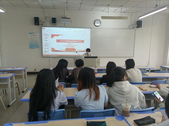 活动开始,张博洋同志通过一个讲述中国发展史的视频引入今天的学习专题,向大家介绍了2022年全国人大会议议程和全国政协会议议程,盘点了2022年两会六大看点以及2022年两会的十个关键词,具体讲述了在疫情之下中国将如何稳定经济大盘、持续加力民生保障等内容。随后,主讲人为同学们阐释了“经济保持恢复发展、创新能力进一步增强、人民生活水平稳步提高、疫情防控成果持续巩固”等2021年的政府工作内容,介绍了2022年经济发展总体要求和政策走向以及2022年政府工作报告