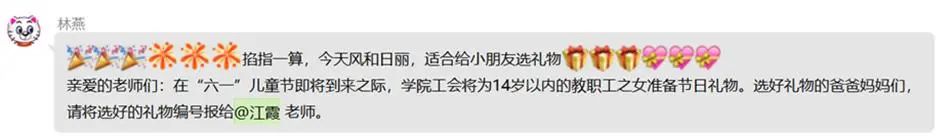 公司工会主席林燕通过QQ群向小朋友们致以节日的问候,向为小朋友们的健康成长倾注无私爱心的青年教师致以亲切的慰问和真挚的感谢。为小朋友们提供望远镜、立体书、书包、水杯、伞等多种礼物。希望小朋友快乐学习,健康成长,把自己发展成为德、智、体、美、劳全面发展的优秀人才;同时,他希望青年教师们爱护子女,培养孩子的责任感,养成良好的行为习惯,树立远大的志向,健全的身心人格,建设和谐、幸福家庭,为学院发展做出新的更大贡献。