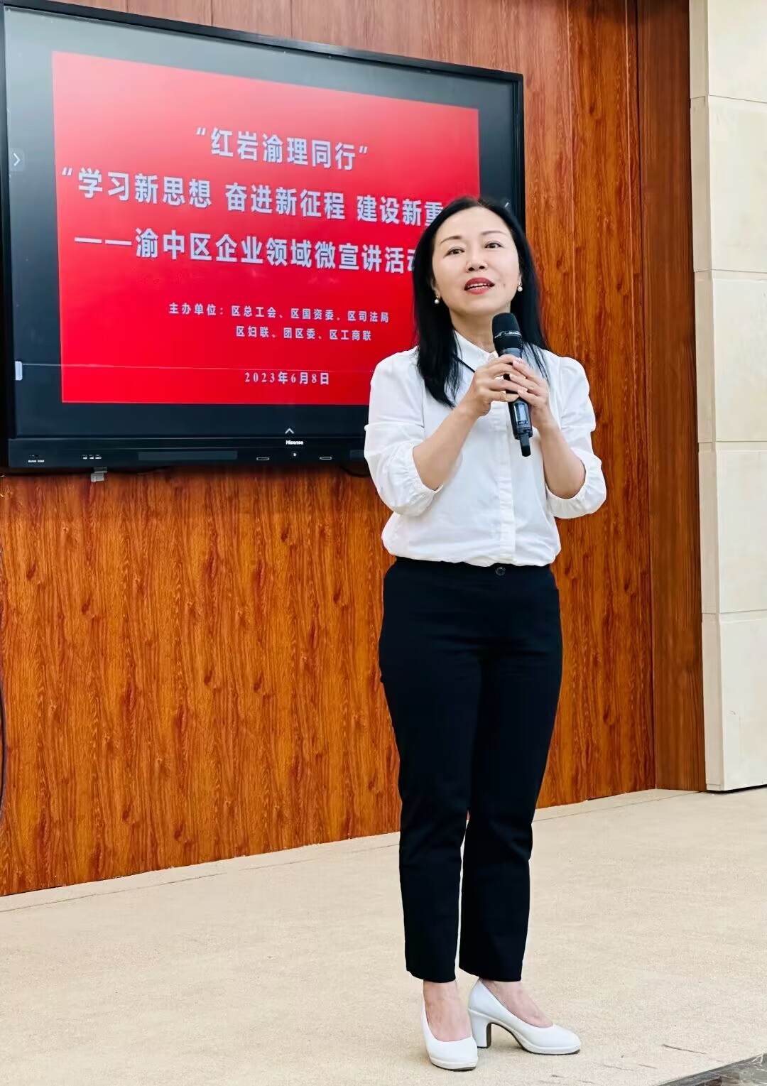 2023年6月9日由渝中区总工会、区国资委、区司法局、区妇联、团区委、区工商联等部门联合主办下顺利举行了渝中区企业领域微宣讲大赛决赛,大赛地点于渝中区区级机关综合大楼进行,以抽签的形式按顺序进行宣讲。参赛选手须在规定时间内围绕新时代党的创新理论、党的二十大精神、市委六届二次全会精神等内容展开宣讲。