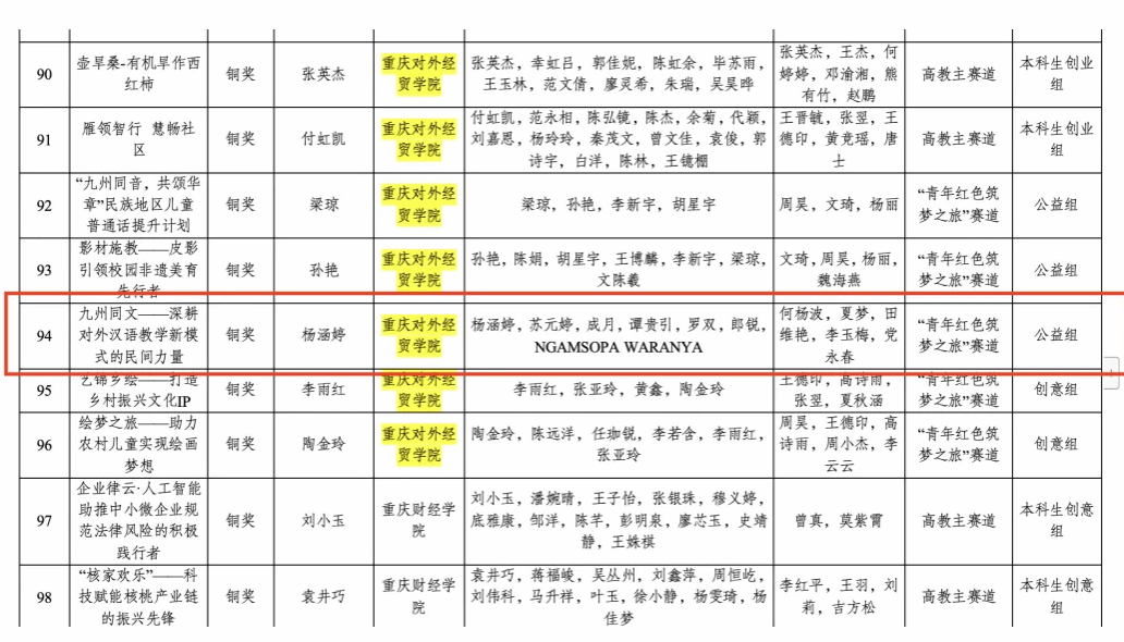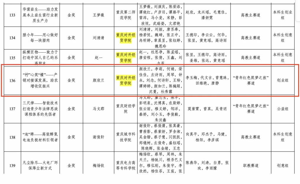 近日,根据《教育部关于举办中国国际老员工创新大赛(2024)的通知》(教高函〔2024〕9号),经学校推荐、专家评审、公开公示等环节,遴选出重庆赛区金奖、银奖、铜奖若干个。 来自公司公海gh555000aa线路检测中心的“‘柠’心筑‘檬’——产销对接谋发展,助农增收促振兴”创业组项目荣获重庆市金奖,“九州同文——深耕对外汉语教学新模式的民间力量”公益组项目荣获重庆市铜奖,李玉梅、代文吉、曾慧珠三位教师荣获优秀指导教师。