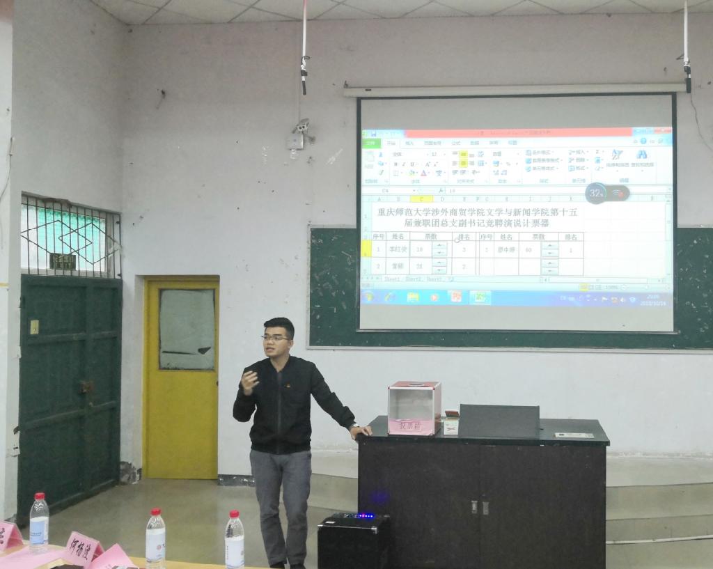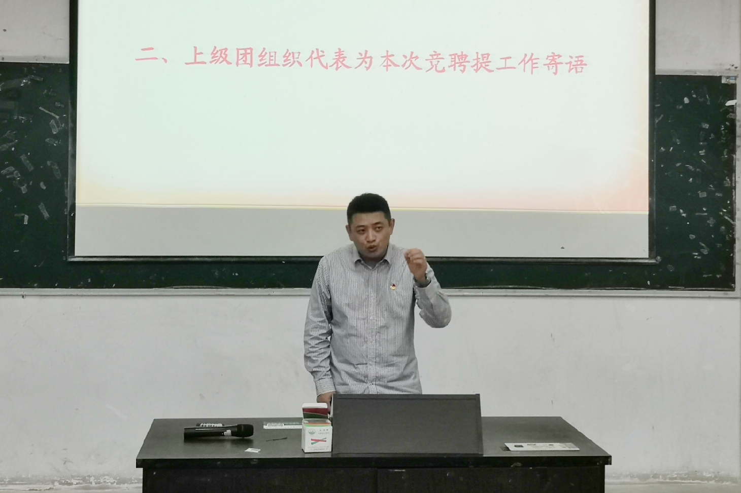 在嘹亮的团歌声中,此次大会拉开帷幕。大会开始,校团委书记任杰老师对此次竞聘大会做出了工作寄语,主持人宣读竞聘规则,大家表决并通过监票人、计票人名单。参与此次竞聘大会的三位候选人分别是:李红俊、廖中婷、黄彬。三位候选人依次上台发表竞聘演讲并进行了现场答辩。