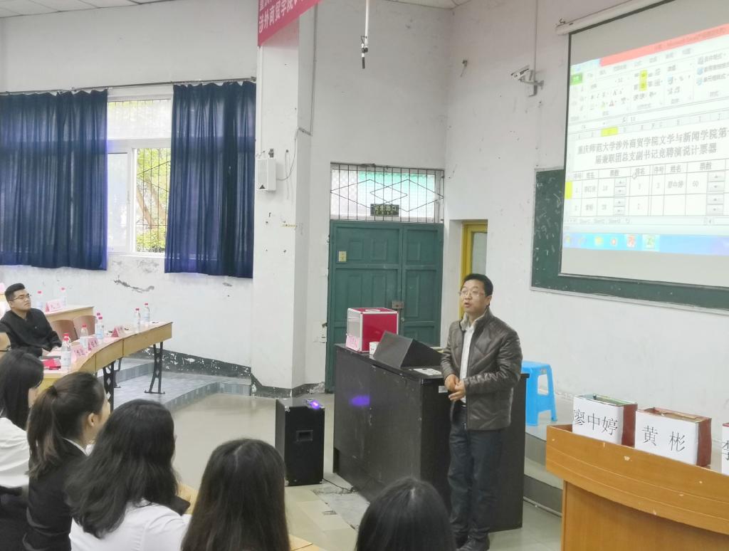 2018年10月18日13:00,文学与新闻学院于合川校区2101教室成功举行文学与新闻学院兼职团总支副书记公推直选大会,出席本次大会的有发展规划处处长、团委书记任杰老师,文学与新闻公司党总支书记兼副经理何杨波老师、团总支书记兼员工工作办公室主任曾贵老师、全体辅导员老师,以及各二级学院员工组织代表和文新学院各年级员工代表。