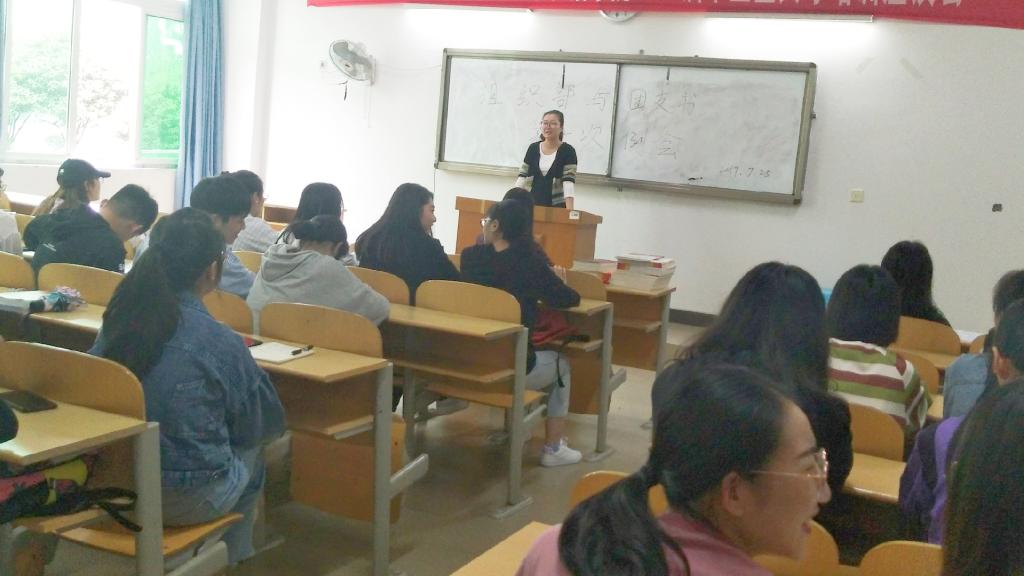 此次会议在嘹亮的团歌声中拉开了序幕。首先,章流韵同学诚挚感谢了各位团支书一直以来在团学工作上的帮助与配合,并对往后的团学工作进行了安排。第十六届团总支员工会组织部部长张玲、副部长罗能瑾、杨沈杰依次进行了自我介绍,随后张玲同学详细说明了本年度团员注册及团费收缴事宜。