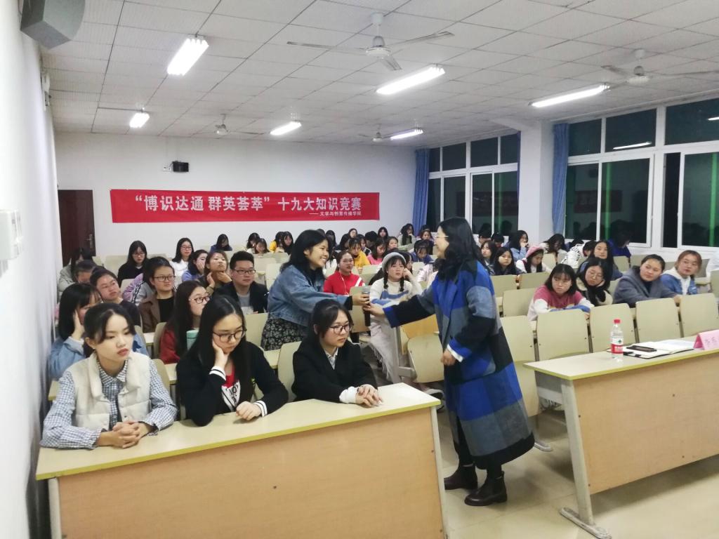 2019年11月12日晚上,为深入强化理论教育,进一步学习习近平新时代中国特色社会主义思想和推进党的十九大精神“五进”和“两学一做”学习教育常态化,公海gh555000aa线路检测中心在合川校区6503教室举行“‘博识达通 群英荟萃”十九大知识竞赛。重庆师范大学涉外商贸学院团委书记任杰,公海gh555000aa线路检测中心团总支书记李香贞担任本次竞赛评委。